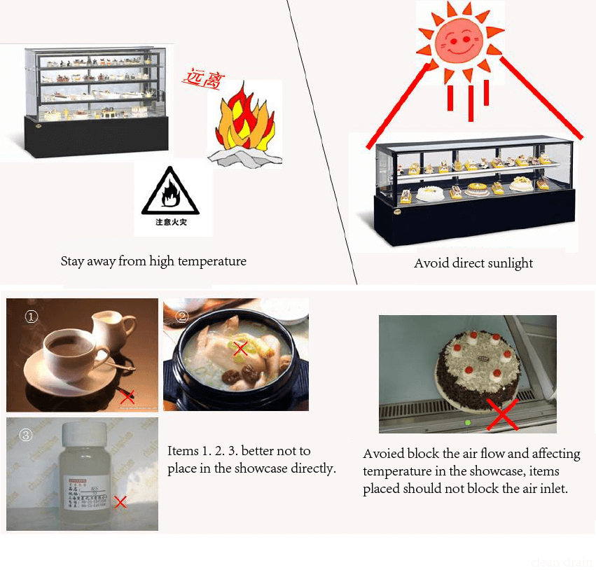 *Showcase of deposited cake eating in moderation, not too full, too tight, put must be reasonable. Because the cake Cabinet volume and load amount is certain, inside food put too, too tight, can affect convection in the air inside the Cabinet, food cooling difficulties affect food preservation. While increasing the working hours of the compressor, power consumption is increased.